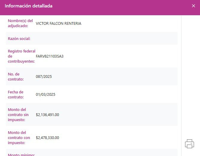 Por su parte, Víctor Falcón Rentería en 2025 ha realizado contratos con el gobierno estatal de Durango que ascienden a más de 34 millones de pesos para otorgar “servicios de vigilancia y limpieza” en hospitales de la secretaría de Salud y en la Fiscalía General de Durango, y para dar “servicios de vigilancia” en los inmuebles de las recaudaciones de rentas en Durango, Gómez Palacio y Lerdo.