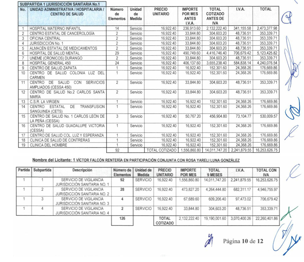 Tan solo en 2023 y 2024 Rosa Yareli Luna González recibió la friolera de casi 90 millones de pesos en dos contratos por “otorgar servicios de vigilancia” en las cuatro jurisdicciones sanitarias de la secretaría de Salud del estado de Durango y en 2025, “en participación conjunta” con Víctor Falcón Rentería, recibió otro contrato por más de 22 millones de pesos, también “por otorgar el servicio de vigilancia” en hospitales, centros de salud e instalaciones de la secretaría de Salud del gobierno del estado de Durango.