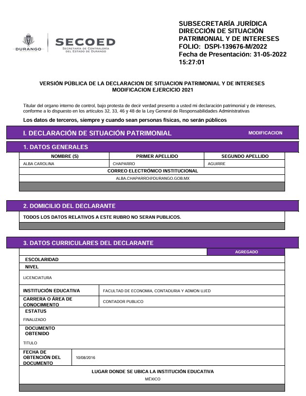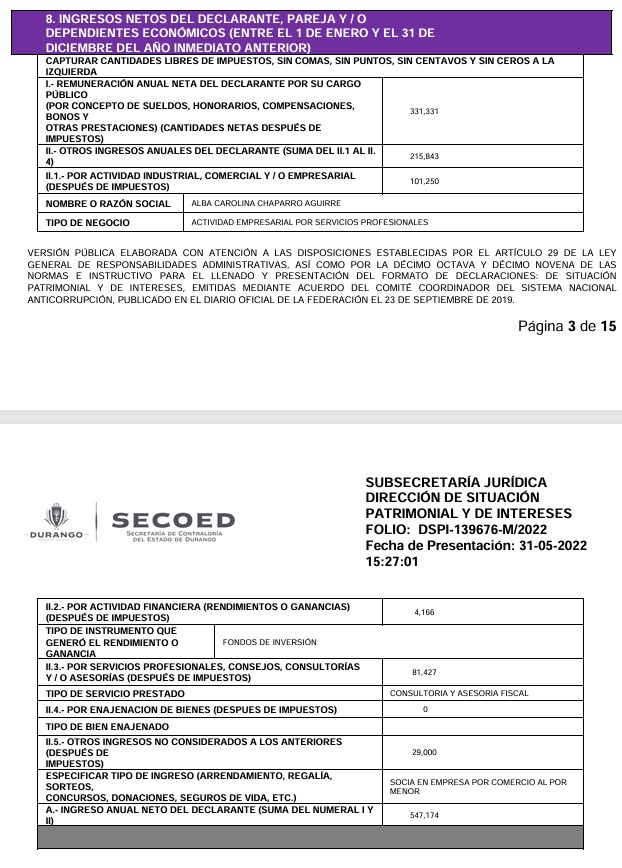 Carolina Chaparro, muy cercana al narcogobernador priista “claudista” Esteban Villegas, llegó a su cargo en 2022 manifestando en su declaración patrimonial un ingreso anual de 547 mil 174 pesos y ser propietaria de una casa de 420 mil pesos; un terreno de 126 mil pesos; otro terreno de 120 mil pesos; un terreno más de 150 mil 500 pesos; una casa de 178 mil pesos; un vehículo de 243 mil 100 pesos y un menaje de casa de 80 mil pesos. Además, en 2022 Carolina Chaparro informó en su declaración patrimonial ser socia de 4 empresas con un ingreso mensual de 55 mil 679 pesos mensuales.