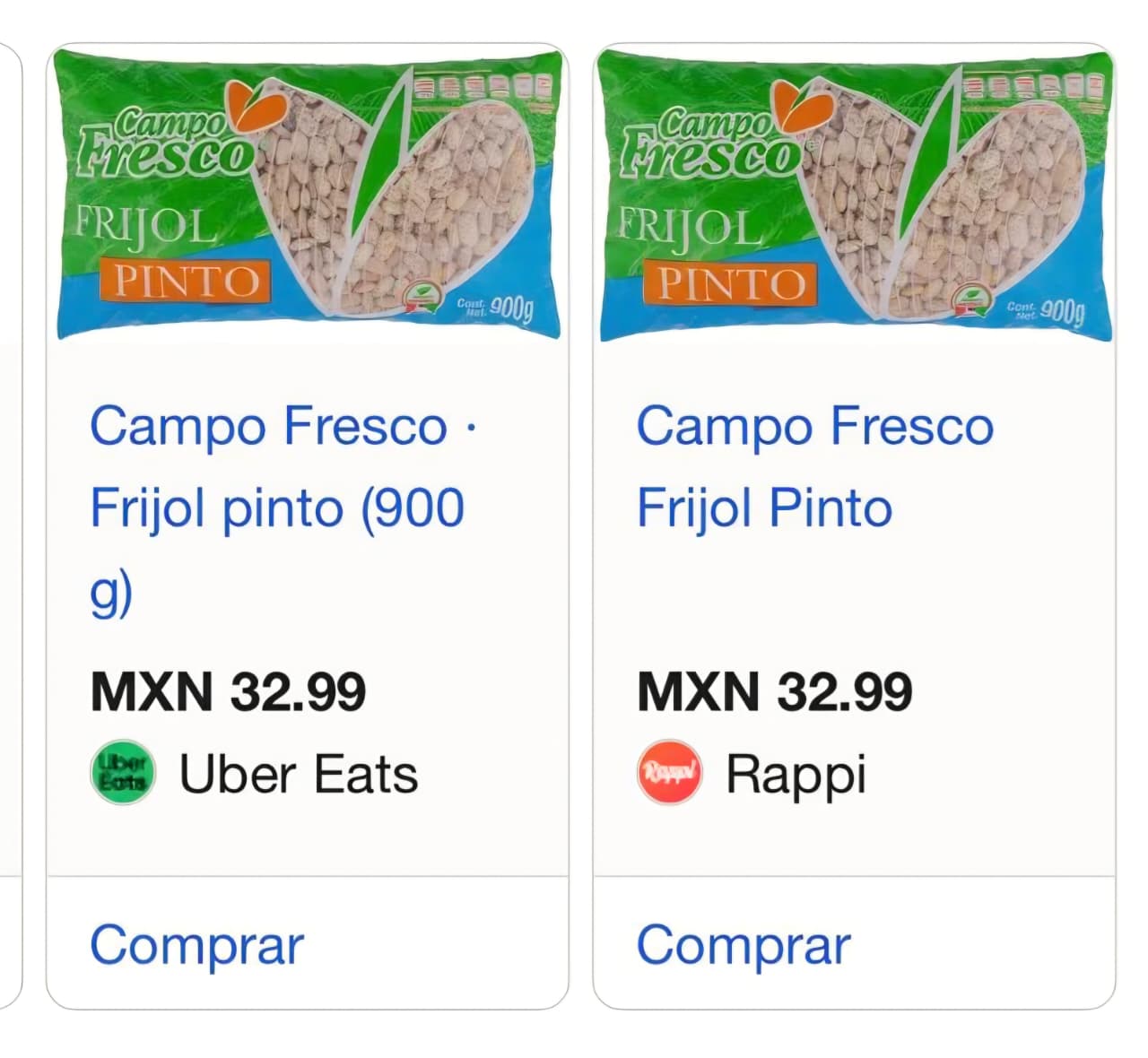 La mayoría de productos adquiridos bajo este contrato presentan sobreprecios escandalosos, como las bolsas de frijol Pinto de un kilogramo, de la marca Campo Fresco, que el DIF Durango adquirió en 44 pesos, mientras en Rappi México cuestan 33 pesos.