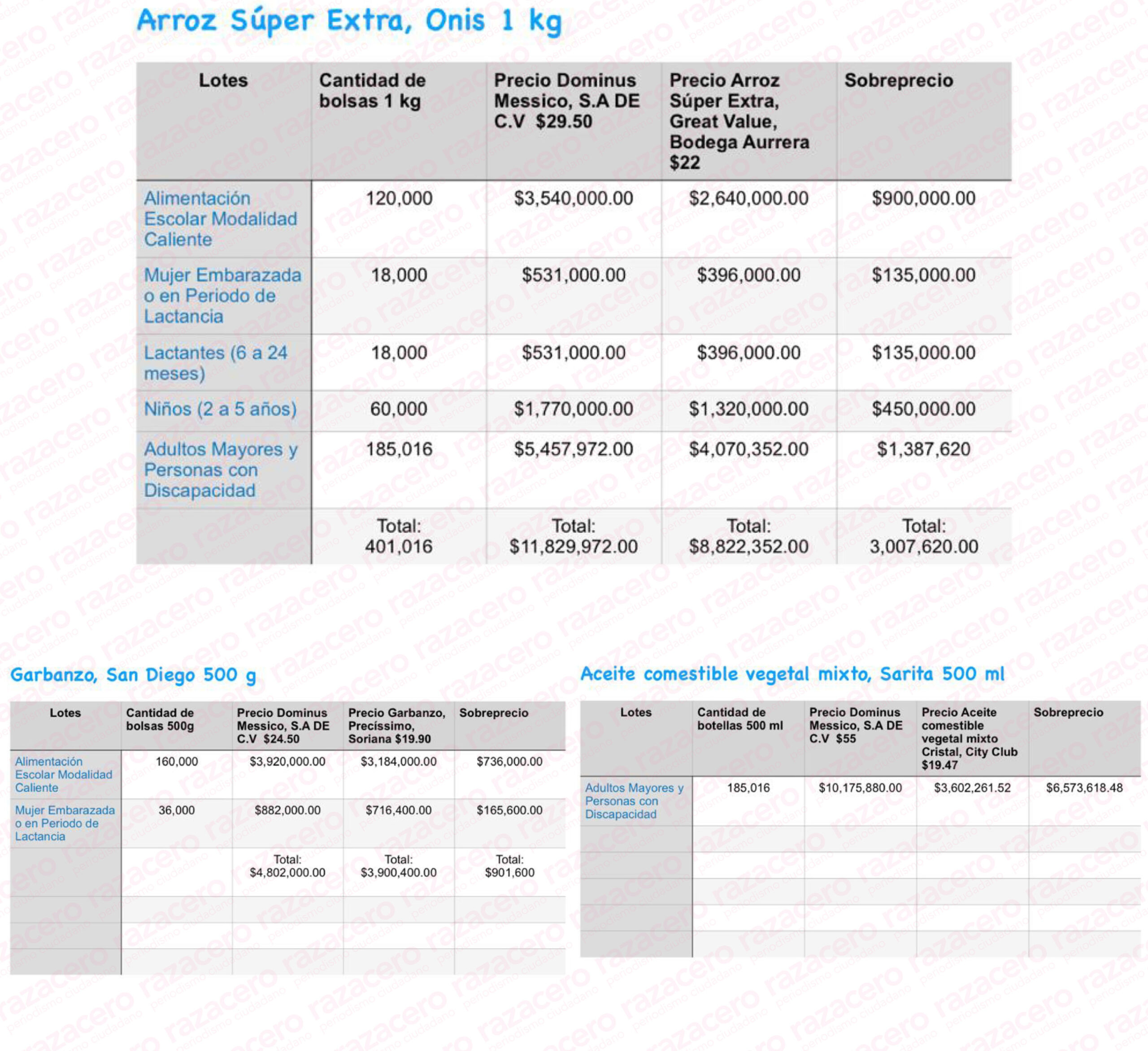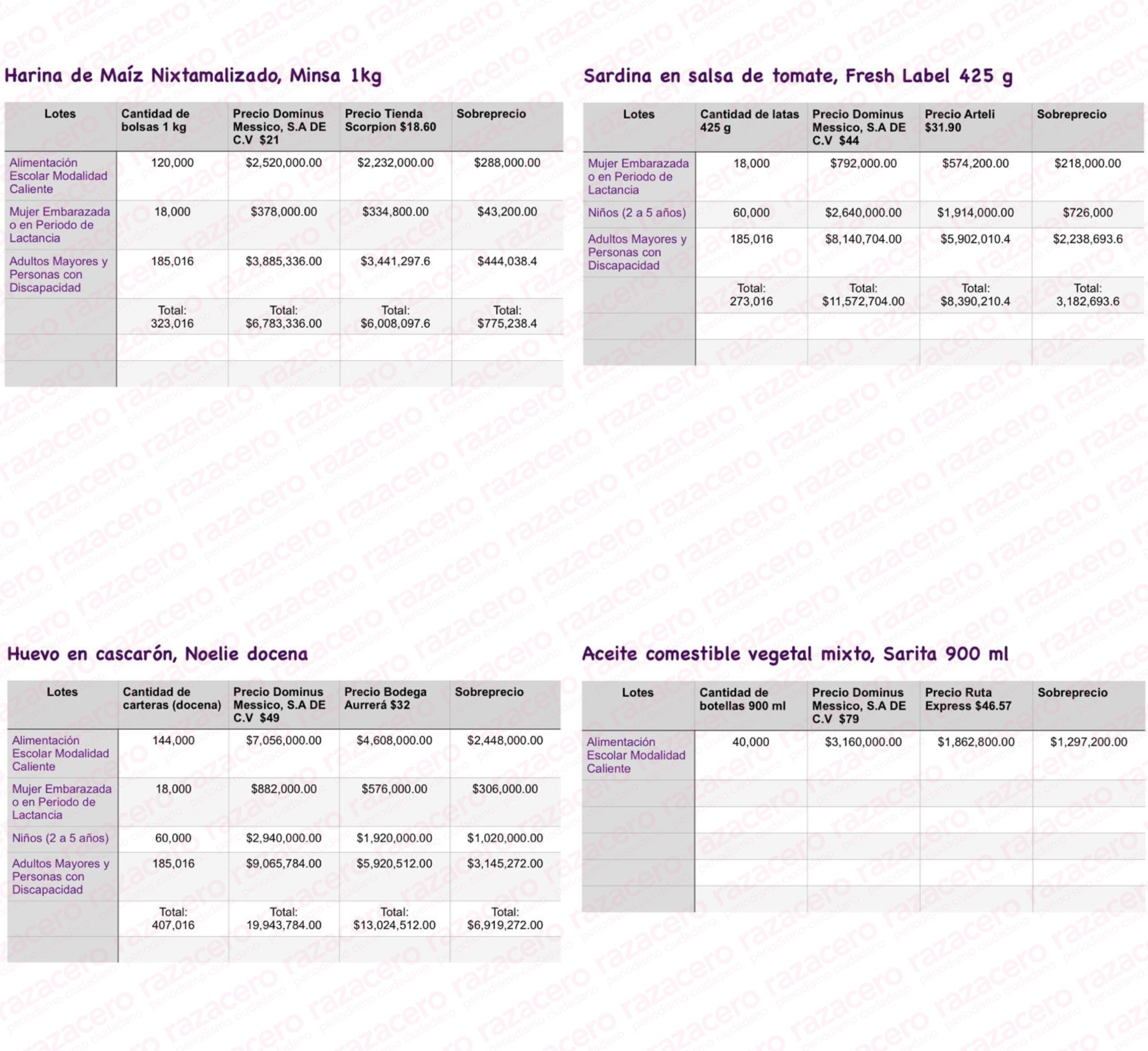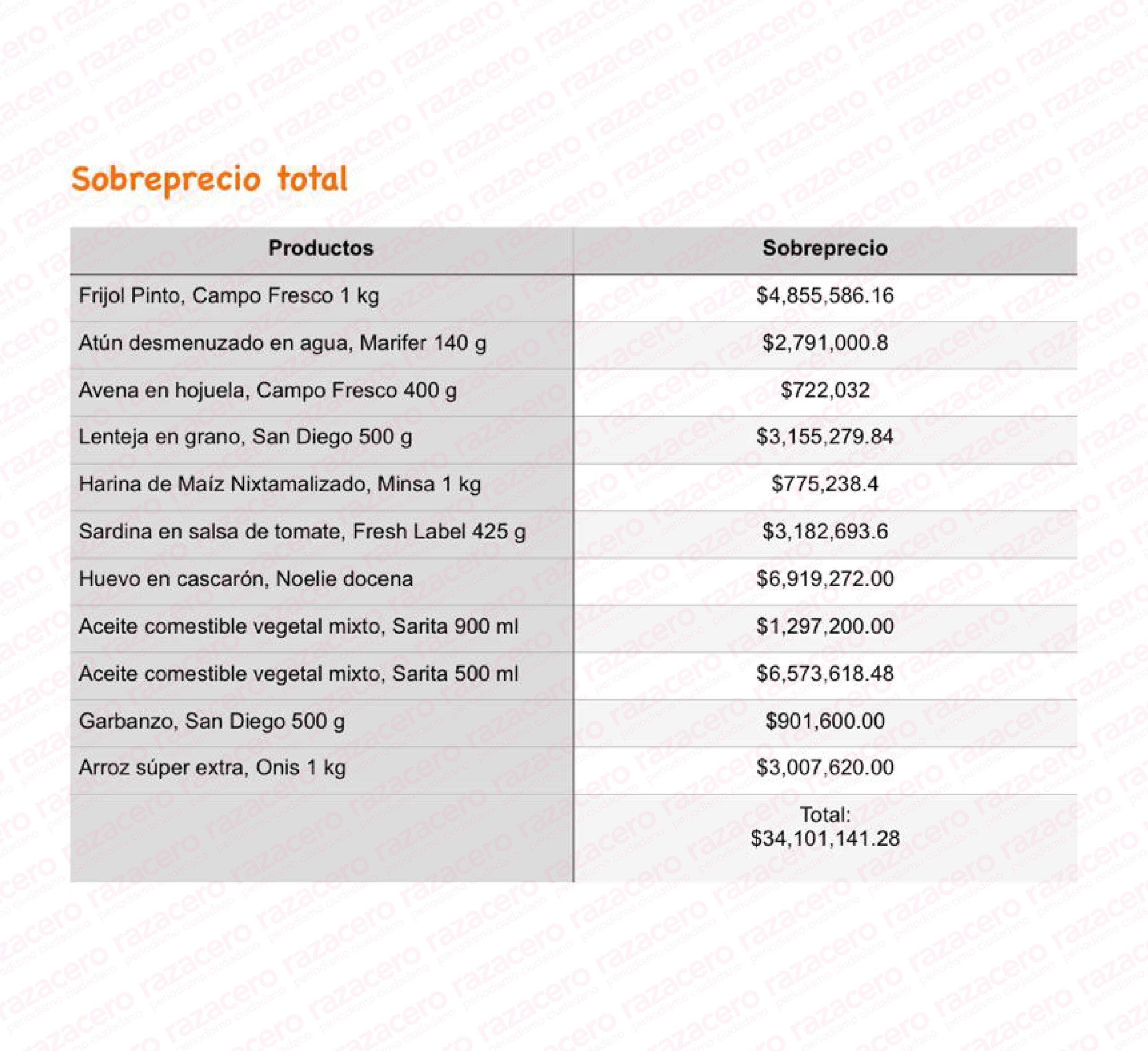 Al final se presenta un cuadro en el que se detallan los sobreprecios totales que el DIF de Marisol Rosso, #LadyDespensas, pagó a la empresa foránea Dominus Messico por todos y cada uno de los productos que adquirió para armar sus paquetes de despensas para la población en situación de pobreza. La suma es abrumadoramente indignante pues supera los 34 millones de pesos.