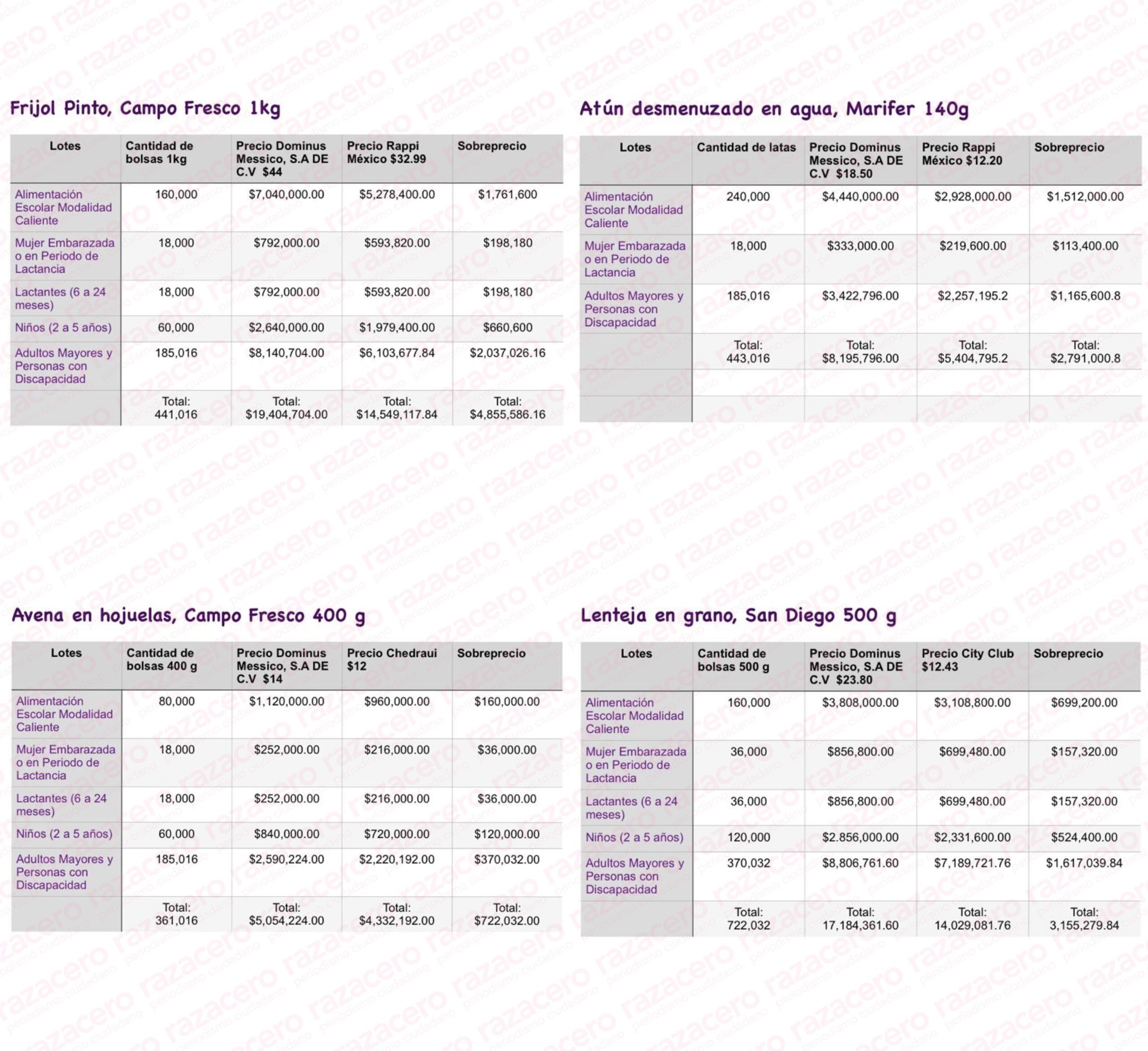 En los cuadros que se presentan a continuación se especifican los lotes que aparecen en el contrato de marras; las cantidades de los productos adquiridos; el precio que pagó por ellos el DIF a la empresa foránea Dominus Messico; el precio que ofrecen otras empresas por los mismos productos y los sobreprecios que el DIF pagó a la empresa Dominus Messico, por cada uno de los productos adquiridos.